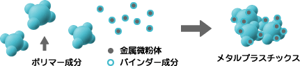 | バインダー成分にコートされた金属微粉体を開発することによりポリマー成分との接着が強く、成形後も安定した物性を保つことが出来ます。 |